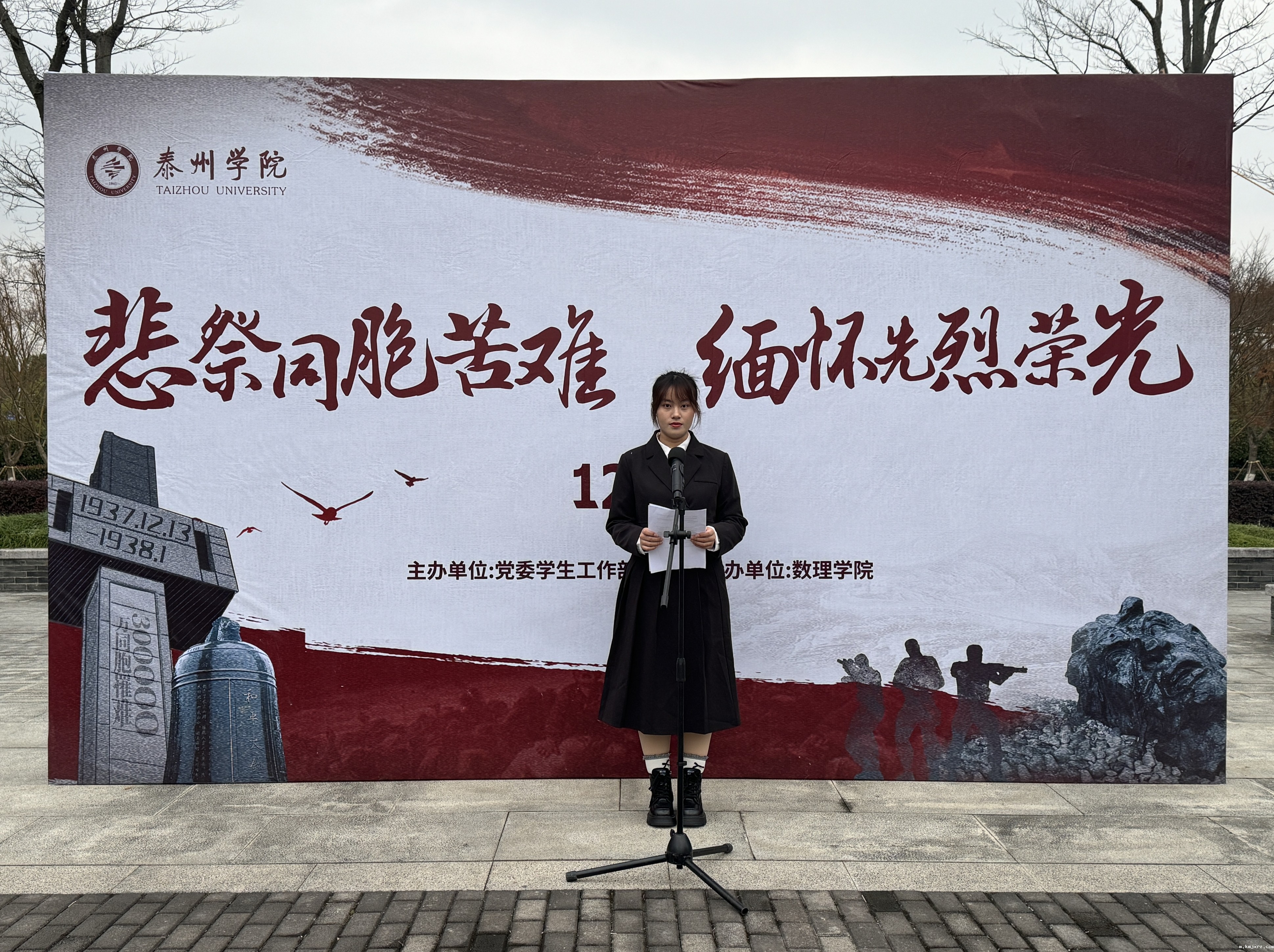伴随着庄严的国歌声,鲜艳的五星红旗冉冉升起,全体师生肃立行注目礼并低头默哀一分钟,缅怀遇难的300000同胞。随后,学生代表王梓涵同学发言,呼吁同学们勿忘国耻,振兴中华。四位学生代表铿锵有力地朗诵《山河泣血,浩气长存》,表达了新时代青年们的心声。最后,数理学院党总支书记江峰进行国旗下讲话,他勉励同学们牢记中华民族艰苦卓绝的奋斗历程,鼓励同学们珍惜和平,努力学习,做新时代中国特色社会主义事业的接班人。